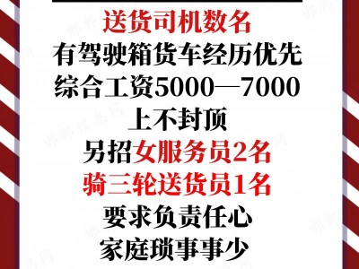 磁县三环闽台农贸市场,招聘送货司机数名,有驾驶箱货车经历优先,综合工资5000—7000上不封顶。另招女服务员2名,骑三轮送货员1名,要求负责任心,家庭琐事事少 20—45岁,电话13230076230,13613206230