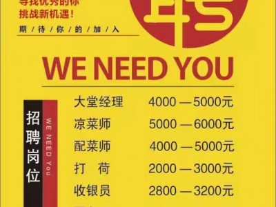 【念川新派川菜招聘】 招聘大堂经理4000—5000,凉菜师5000—5000,配菜师4000—5000,打荷2000—3000,收银员2800—3200, 服务员2800—3200,洗碗工2000—2500,保洁2000—2500。地址:友谊大街与仁和路交叉口。