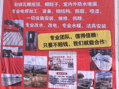 主营业务钢结构施工、安装,厂房、仓库装饰、装修彩钢瓦棚房顶、棚院子,室内外防水堵漏专业电焊加工。设备、钢结构、防腐、喷漆
