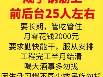 山西汾阳需成手钢筋工,前后台25人左右长期,管吃住,月2000元,勤快能干,服从安排,工程完工半月结清,喝大酒事多,因生活习惯不同少数民族勿扰。电话:,17631001775