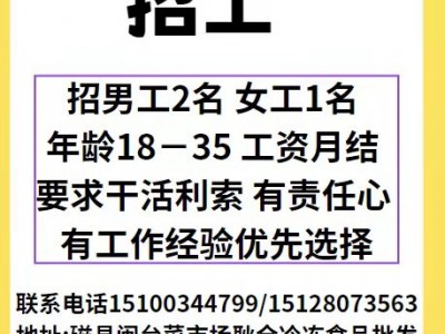招男工2名,女工1名,年龄18-35,工资月结,要求干活利索,有责任心,有工作经验优先选择