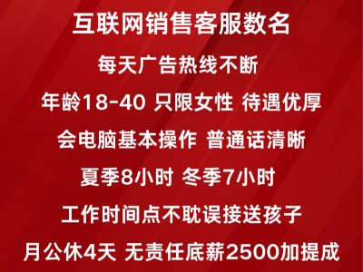 磁县本地招聘 互联网销售客服数名 年龄18-40 只限女性 待遇优厚 会电脑基本操作 普通话清晰 8小时工作制 月公休4天 综合工资4000-7000 只招收长期