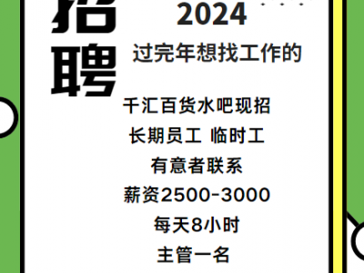 招聘 过完年想找工作的,你觉得合适我觉得满意那就来我这里看看吧!千汇百货水吧现招长期员工,临时工 薪资2500-3000每天8小时 主管一名薪资3200-3500 有意者联系