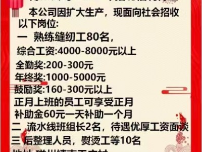 招聘熟练缝纫工数名,后整理人员5名,大烫工2名,地址磁县中华路三里屯对面南王庄村博翔服装有限公司。