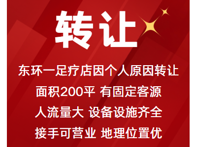 东环一足疗店因个人原因转让,面积200平,有固定客源,人流量大,设备设施齐全。接手可营业,地理位置优,停车方便,有意者详聊!
