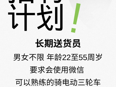 招聘长期送货员,男女不限,年龄22至55周岁。要求会使用微信,可以熟练的骑电动三轮车,能吃苦耐劳。有责任心。有汽车驾驶证者优先!工资面议,非诚勿扰!