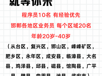 招聘 程序员10名,有经验优先 邯郸各地区业务员.每个区域20名。年龄20岁-40岁,(从台区,复兴区,邯山区,峰峰矿区,肥乡区,永年区,成安县,临漳县,大名县,鸡泽县,邱县,磁县,馆陶县,广平县,魏县,曲周县,涉县,武安市)。