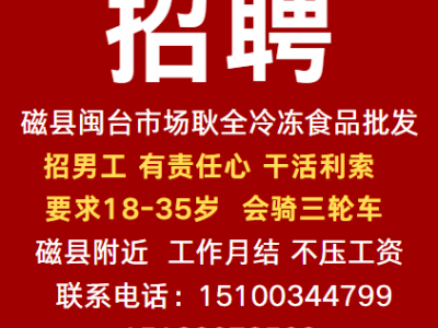 磁县闽台市场耿全冷冻食品批发招男工 有责任心 干活利索 要求18-35岁 会骑三轮车 磁县附近 工作月结 不压工资 联系电话:15100344799 15128073563