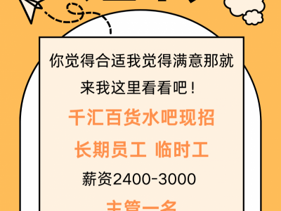 招聘 你觉得合适我觉得满意那就来我这里看看吧!千汇百货水吧现招长期员工,临时工 薪资2400-3000 主管一名薪资3200-3500 有意者联系
