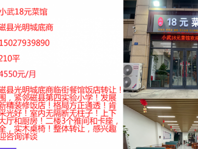 磁县光明城底商面积210平租4550元/月转8万5共两层 磁县光明城底商临街餐馆饭店转让!周边小区包围,紧邻磁县第四实验小学!发展空间大!全新精装修饭店!格局方正通透!肯德基门市,采光好!室内无隔断无柱子!上下两层,一楼大厅和厨房!二楼3个雅间和卡座,全套设备齐全,实木桌椅!整体转让,感兴趣的老板,评论区留言 小武18元菜馆 磁县光明城