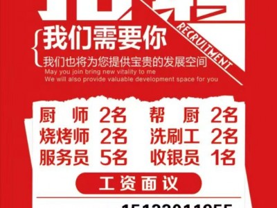 招聘:厨 师 2名 帮 厨 2名 洗刷工 2名 烧烤师 2名 服务员 5名 收银员 1名