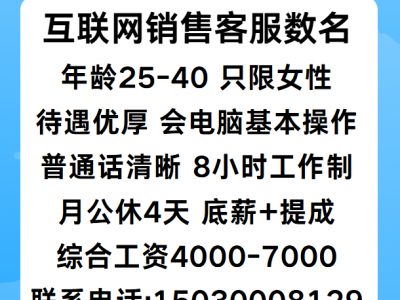 磁县本地招聘 互联网销售客服数名 年龄25-40 只限女性 待遇优厚 会电脑基本操作 普通话清晰 8小时工作制 月公休4天 底薪+提成综合工资4000-7000 联系电话:15030008129 只招收长期