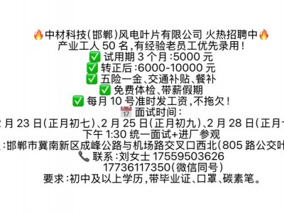 中材科技(邯郸)风电叶片有限公司火热招聘中 产业工人50名,有经验老员工优先录用! ✅试用期3个月:5000元 ✅转正后:6000-10000元 ✅五险一金、交通补贴、餐补 ✅免费体检、带薪假期 ✅每月10号准时发工资,不拖欠! 面试时间: 2月23日(正月初七)、2月25日(正月初九)、2月28日(正月十二) 下午1:30统一面试+进厂参观